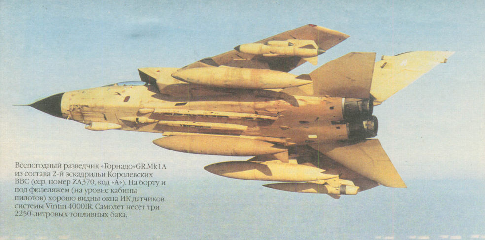 Регистрационный номер: ZA370 Всепогодный разведчик «Торнадо GR.Mk IA из состава 2-й эскадрильи Королевских ВВС (сер. номер ZA370, код «А»). На борту и под фюзеляжем (на уровне кабины пилотов) хорошо видны окна ИК датчиков системы Vintin 4000IR. Самолет несет три 2250-литровых топливных бака.