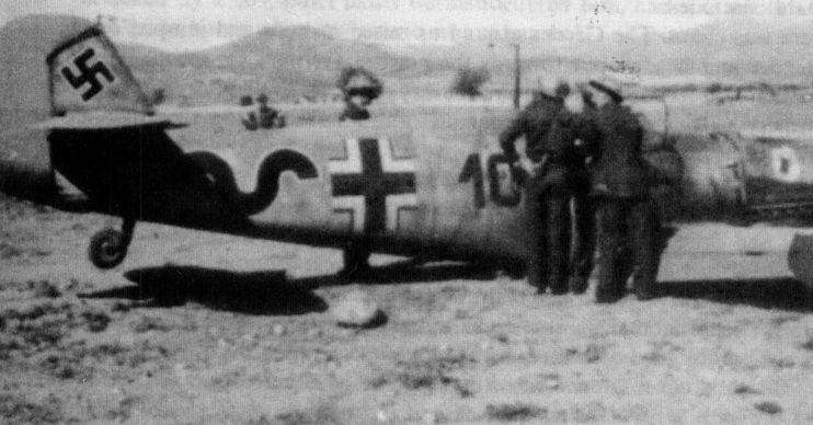 Bf109E-7 (пилот унтер-офицер Фриц Борхерт) из состава III/JG 77, сбитый Томасом Пэттлом над аэродромом Ларисса, 20 апреля 1941 г.