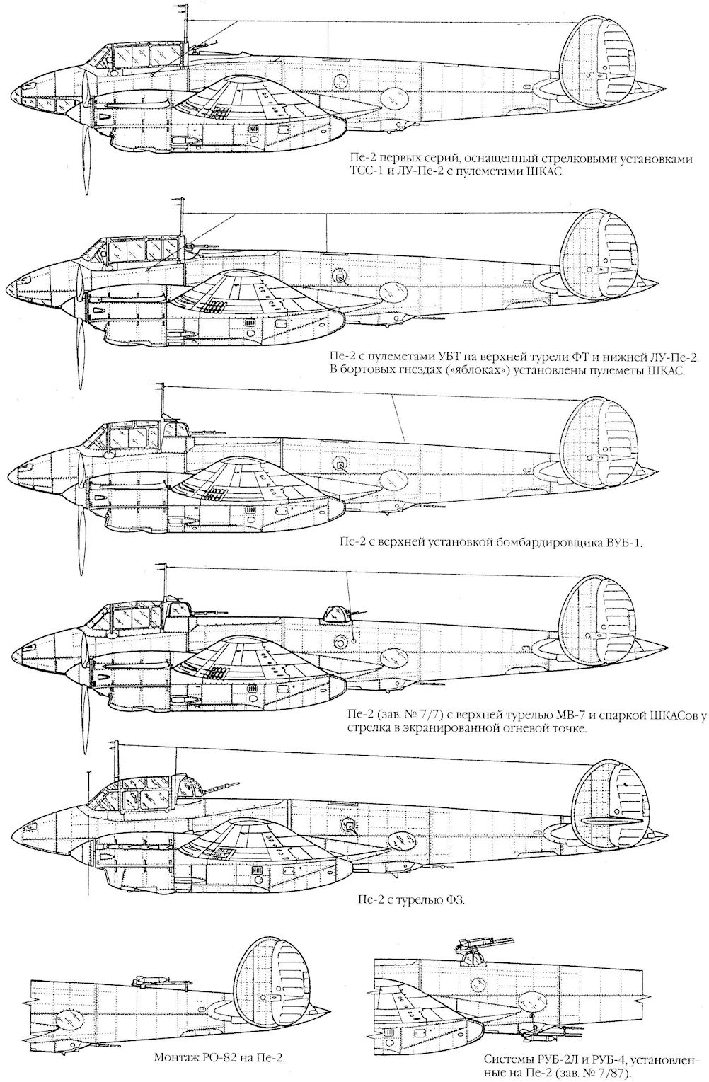 Пе-2 с пулеметами УБТ на верхней турели ФТ и нижней ЛУ-Пе-2. В бортовых гнездах («яблоках») установлены пулеметы ШКАС.