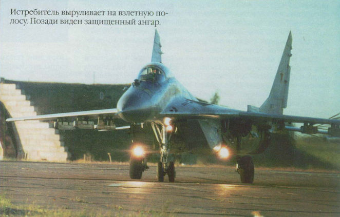 Истребитель выруливает на взлетную полосу. Позади виден защищенный ангар.