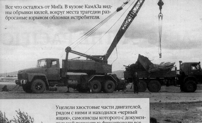 Все что осталось от Мига. В кузове КамАЗа видны обрывки килей, вокруг места трагедии разбросанные взрывом обломки истребителя.