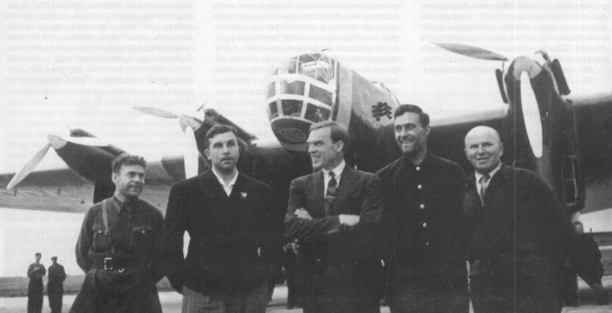Последнее фото перед вылетом. Слева направо: штурман Левченко, Н.Я.Галковский (радист), С.А.Леваневский (командир экипажа), Н.Г.Кастанаев (второй пилот) и Н.Н.Годовиков (бортинженер). Аэродром Щелково, 12 августа 1937 г.