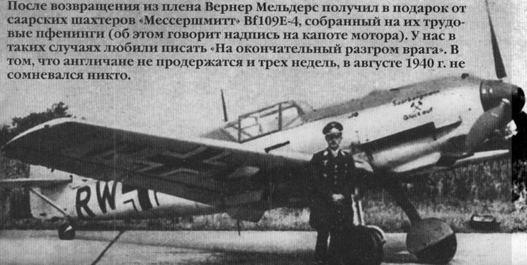 После возвращения из плена Вернер Мельдерс получил в подарок от саарских шахтеров «Мессершмитт» Bf109E-4, собранный на их трудовые пфенинги (об этом говорит надпись на капоте мотора). У нас в