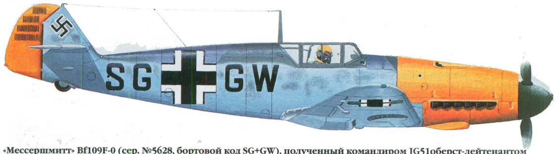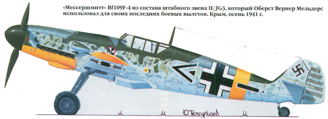 Напечатанная в американском издании Messerschmitt Bf109 in action (part 2) фотография Bf109F-2 командира JG51, снабжена подписью, которая однозначно указывает на то, что изображенный самолет принадлежит Вернеру Мельдерсу. К сожалению, авторы не смогли указать его серийный номер, а анализ окружающего пейзажа однозначно указывает на то, что снимок сделан осенью 1941 г., когда Мельдерс уже сдал эскадру майору Ф.Беку, а сам находился в Крыму, где в основном пользовался штабными истребителями JG3.