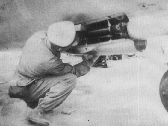 Подготовка оружия к боевому вылету. Механик по авиавооружению старшина Михаил Кузнецов осматривает «главный калибр» истребителя МиГ-15 - 37-мм автоматическую пушку Н-37Д. По массе секундного залпа ей не было равных в то время, а 730-граммовый снаряд даже сейчас может с легкостью превратить в груду металлолома практически любой самолет.