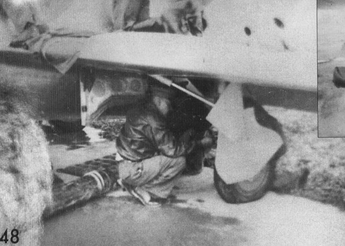Подготовка истребителя МиГ-15 к боевому вылету. Хорошо виден кислородный баллон высокого давления, и открытые лючки в хвостовой части фюзеляжа. Обратите внимание: для того чтобы не повредить дюралевую обшивку крыла, механики работают, стоя на брезенте.