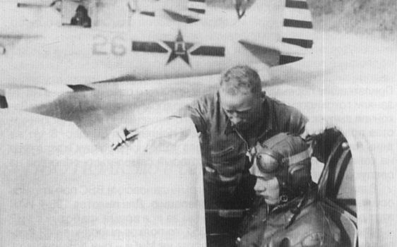 Старшие лейтенанты Карелин и Абрамович проверяют готовность истребителя Ла-11 к полету. 351-й ИАП, аэродром Цзянвань, лето 1950 г.