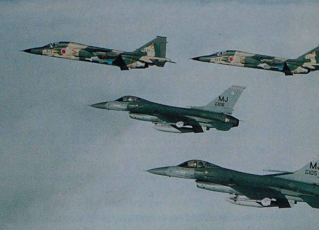 Symbol of Japanese-American co-operation in defence of the archipelago is this formation with F-1s from the 3rd Hikotai and F-16s from the 432nd FW, both operating Misawa.