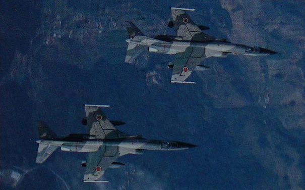 Bearing a close resemblance to the Sepecat Jaguar, the Mitsubishi F-1 was derived from the indigenous T-2 trainer. These two aircraft are on the strength of the 6th Hikotai, Tsuiki.