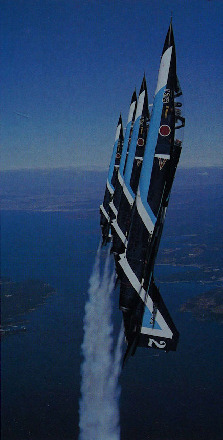 Japan’s ‘Blue Impulse’ display team flew the Mitsubishi T-2 advanced trainer until 1995. T-2s serve with two flying training squadrons, the aerobatic team being on the strength of the 21st Hikotai - it will transition to the Kawasaki T-4 in 1996.