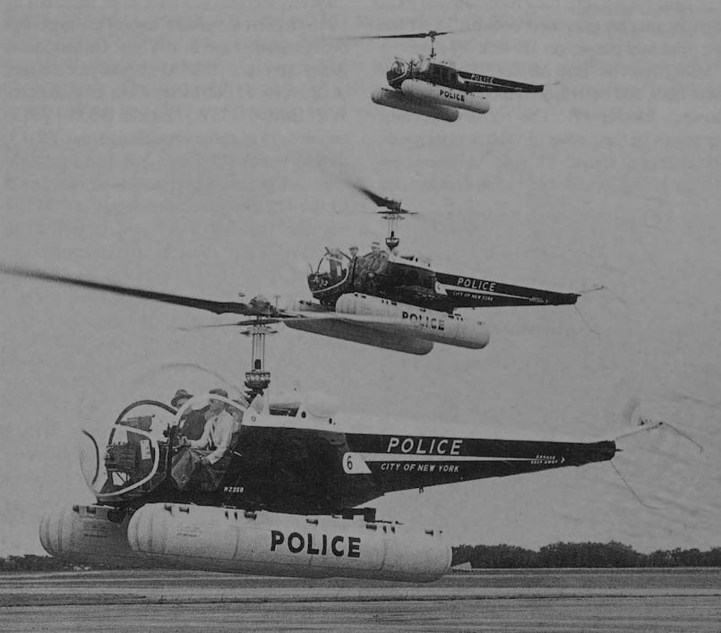 Three early flexible nylon float-equipped Bell 47Ds, the first variant with the now familiar bubble canopy, pose for the manufacturer’s photographer prior to delivery to the City of New York Police Department which used the type for many years, including later Model 47Js during the 1960s.