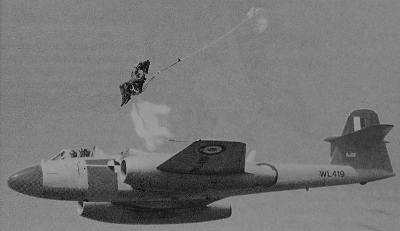 Регистрационный номер: WL419 High performance introduced a number of additional problems to the fighter designer, not least of which was the safe extraction of the crew during flight at high speed/low altitude. This is an airborne trial of a Martin-Baker Mk 16L ejection seat from a Gloster Meteor.