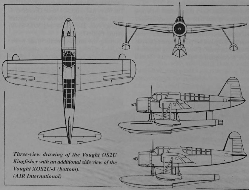 Three-view drawing of the Vought OS2U Kingfisher with an additional side view of the Vought XOS2U-1 (bottom).