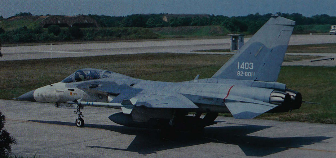 Emerging from its hardened shelter at Ching Chuan Kang, Ching-Kuo 82-8011/1403 of the 3rd TFW is armed with a pair of TC-1 Sky Sword infra-red seeking missiles and is carrying a centre-line fuel tank.