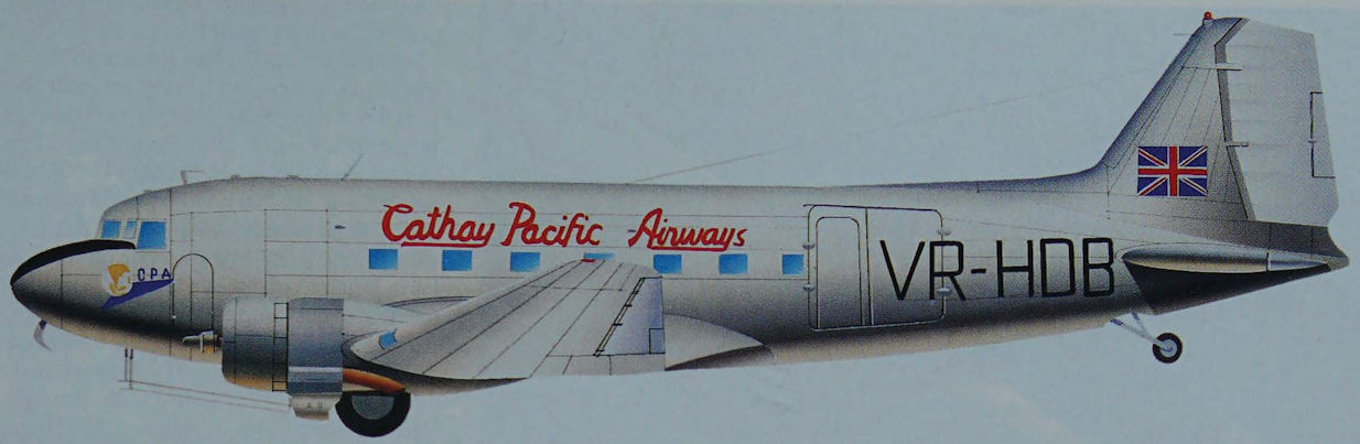 Регистрационный номер: VR-HDB [2] Douglas DC-3 VR-HDB Betsy resplendent in natural metal, with red titling and sporting a Union Jack on the fin. In its former guise as C-47 41-18385 Betsy it was the first aircraft acquired by Roy Farrell who, together with Sydney de Kantzou, flew the aircraft on non-scheduled cargo and passenger flights in South East Asia and Australasia prior to forming Cathay Pacific Airways.