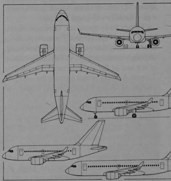 General arrangement of the proposed 100-seat version of the IPTN N-2130 with additional side views of the smaller, 80-seat version (lower left) and larger 130-seat version (lower right).