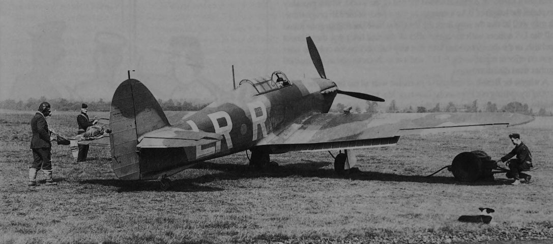 Регистрационный номер: L1909 All Set: A Hurricane (with v.p. airscrew) with pilot donning his brolly, starter ready, and flaps depressed for take-off.