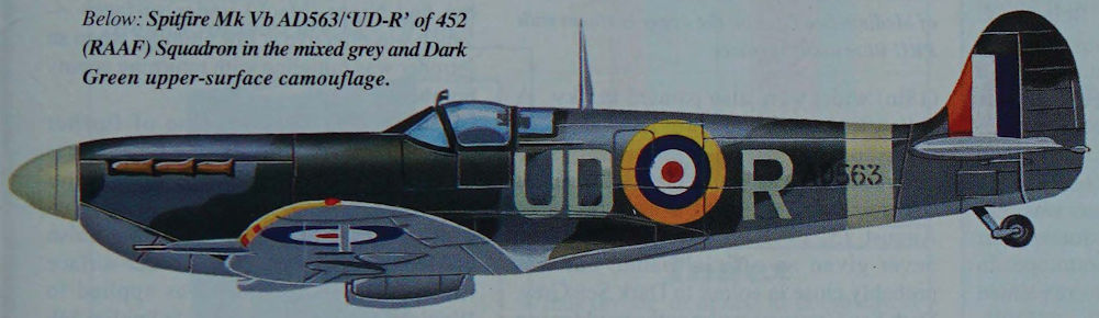 Регистрационный номер: AD563 Spitfire Mk Vb AD563/‘UD-R’ of 452 (RAAF) Squadron in the mixed grey and Dark Green upper-surface camouflage.