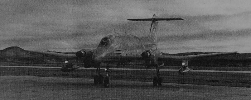 Grupo 4 Pucara taxiing at Comodoro Rivadavia after returning from a surveillance mission, note the underwing drop tanks.