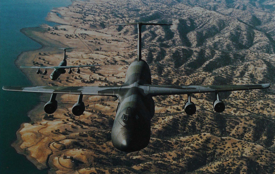 Forming the backbone of the USAF’s strategic airlift capabilities are the Lockheed C-5A/B Galaxy (foreground) and C-141B StarLifter (behind).