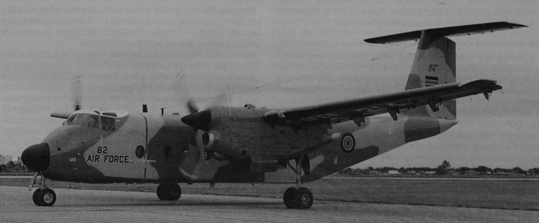 Upgraded and modified with new turboprops, the DHC-4 became the DHC-5 Buffalo and continues to serve with around 16 air arms. This example, 214, is seen prior to delivery to the Kenyan Air Force on November 5, 1986. Although this aircraft was written-off in 1982, the nine other examples delivered to Kenya remain in service.