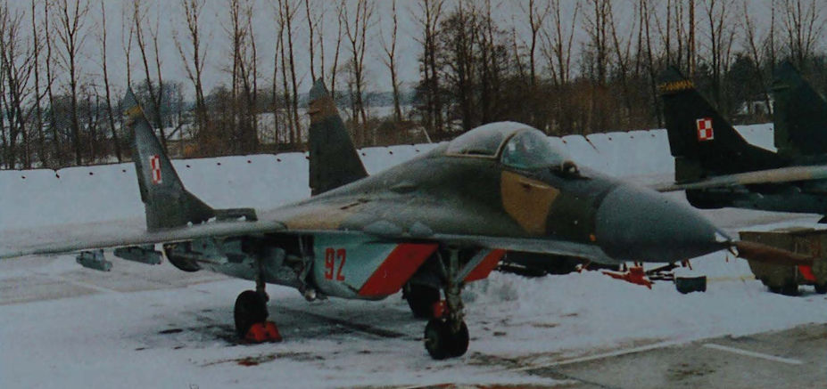 Former Czech Air Force MiG-29 Fulcrum 9207, now serialled 92 with the Polish Air Force, is one of the ten examples recently transferred between the two countries. Note that the aircraft at present still retain Czech-style camouflage together with the tiger striped fin band of its previous Czech unit and have also had the red/white Polish national szachownice markings applied in the old style to match the existing MiGs, which have yet to be repainted in the new, reversed, colours.