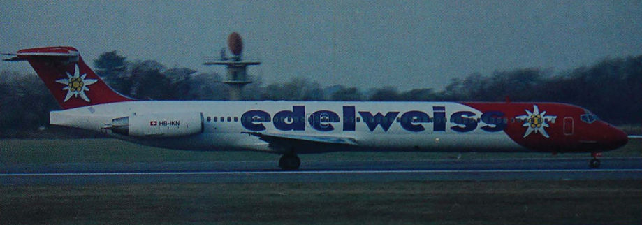 Регистрационный номер: HB-IKN, G-GMJM With Airtours International in the process of replacing its MD-83s with A320s, several of the former have already passed on to other operators, including G-GMJM which was rolled-out at Manchester/Ringway on January 26, 1996 as HB-IKN in the eyecatching colours of new Swiss carrier Edelweiss - it is seen here departing on delivery on January 31. Of the other MD-83s, one has gone to Eurofly and one to Far Eastern Air Transport whilst a second example will go to Edelweiss, one to Sunway of Turkey and two to Reno Air.