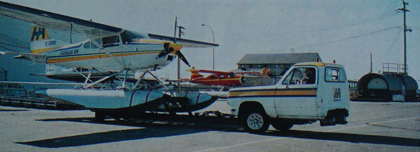 Beaching seaplanes used to be a long, tedious job. Not any more. Now an old car with its back cut off and a hydraulic fork lift simply picks up the floatplane at the bottom of the ramp and carries it ashore.