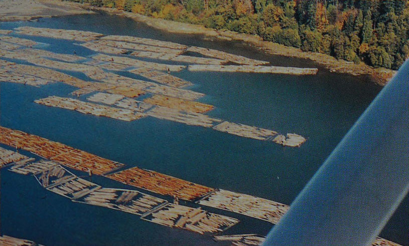 This view from a Cessna 185 is typical of the log-booms buyers want to inspect. Pilots must identify the specific log-boom in which his passengers are interested and land as close as possible to save time taxiing.