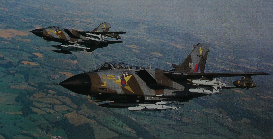 More than enough weapons to cause alarm among operators of hostile radars. Two Tornado GR.1s of 31 Squadron carrying seven BAe ALARM anti-radiation missiles.