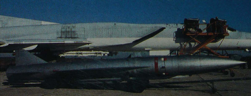 Up to three Raduga Kh-22MP (AS-4 Kitchen) anti-radiation missiles can be carried by the Tu-22M Backfire and up to two by the Tu-95 Bear-G. There are two variants of the Kh-22, the other having a nuclear warhead and inertial guidance.