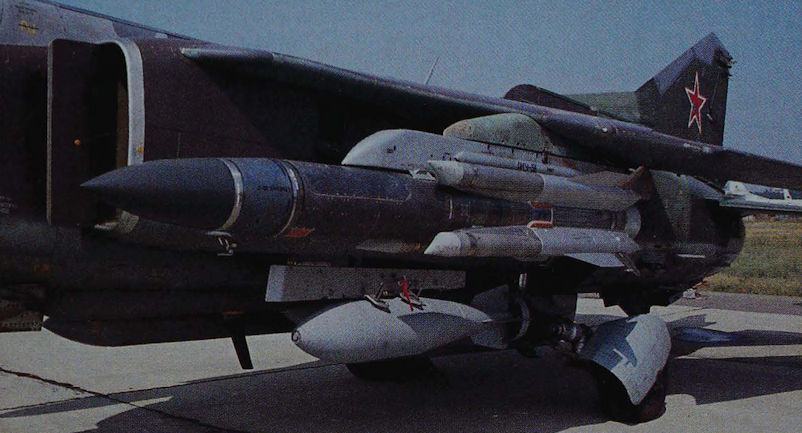 High speed anti-radiation missiles give air-defence radar operators little time to shut down their systems before they are destroyed. The Zvezda Kh-31 (AS-17 Krypton) ARMs are powered by ramjets to give a maximum speed of Mach 3. A Kh-31P is seen here under the port wing of a MiG-27K.
