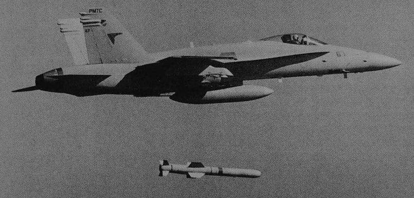 Although still undergoing operational evaluation during Operation Desert Storm, the McDonnell Douglas AGM-84 SLAM was successfully deployed against an Iraqi hydroelectric plant. It is seen here during trials with an F/A-18 Hornet.