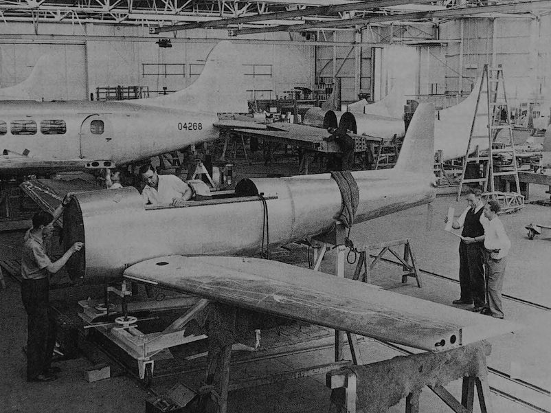 Chipmunk production started at Hatfield alongside Dove production, before both were later transferred to the Chester factory. Seen here is one of the first production examples under assembly in 1949, with Dove production under way behind.