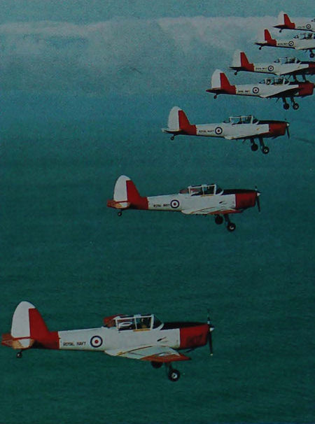 Seven of the Royal Navy/Britannia Royal Naval College Chipmunk T.10s from Plymouth/Roborough pose for the camera near RNAS Culdrose, Cornwall, on January 6, 1994, as a final salute to the type’s retirement from RN service before replacement by civilian-registered Grob 115s.