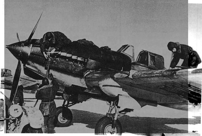 Groundcrew preparing an RS-82-armed Il-2 for its next sortie. Note the serial number on the front of the undercarriage fairing.Самолёты на фотографии: Ильюшин Ил-2 - Россия - 1940