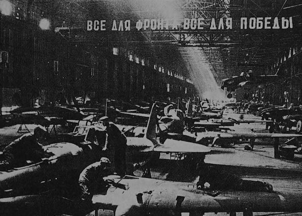 Il-2s on the production line at Kuibyshev. The slogan reads Everything for the Front - Everything for Victory.