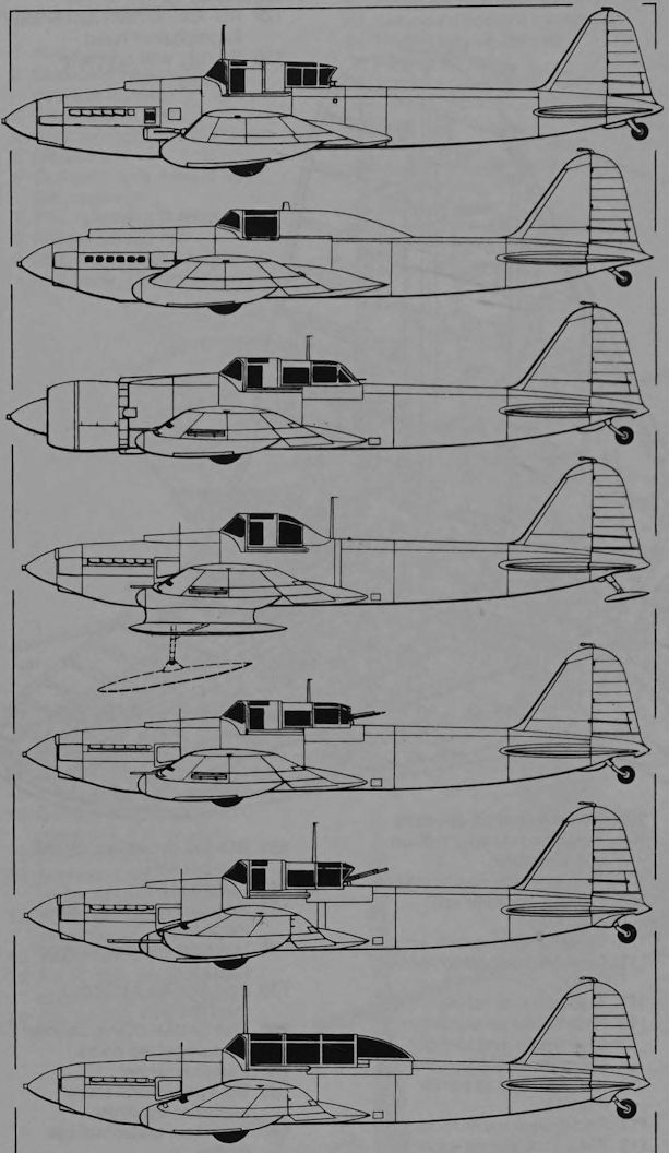 Side views of (from top to bottom) TsKB-55, TsKB-57, Il-2 (M-82), Il-2 (skis), Il-2M, Il-2/3M and Il-2U.