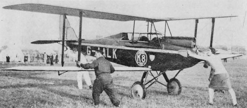 Регистрационный номер: G-AALK Miss Winifred Spooner has help to move G-AALK as "K8" in the 1930 Challenge Internationale de Tourlsme. Lifting the tail by the tailplane bracing strut allowed one person to move the Moth, but on rough ground help was needed to push.
