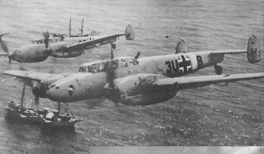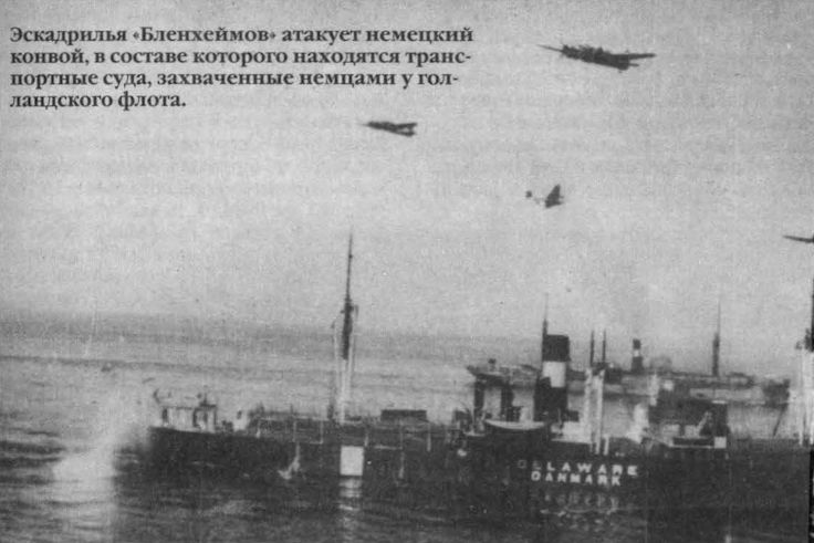 Эскадрилья "Бленхеймов" атакует немецкий конвой, в составе которого находятся транспортные суда, захваченные немцами у голландского флота.