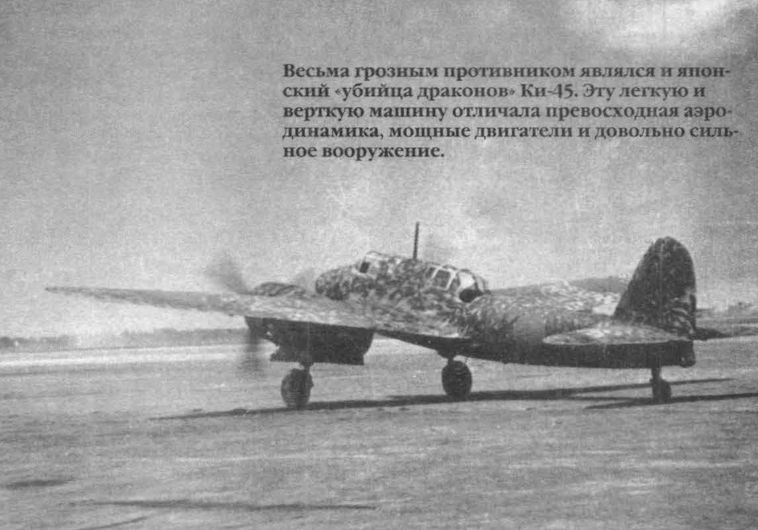Весьма грозхным противником являлся и японский "убийца драконов" Ки-45. Эту легкую и верткую машину отличала превосходная аэродинамика, мощные двигатели и довольно сильное вооружение.