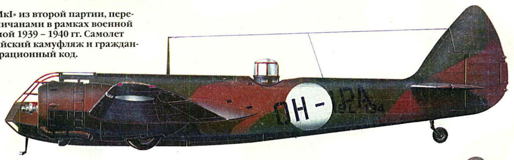Регистрационный номер: BL-134, OH-IPA "Бленхейм Mk I" из второй партии, переданной англичанами в рамках военной помощи зимой 1939-1940 гг. Самолет имеет английский камуфляж и гражданский регистрационный код.