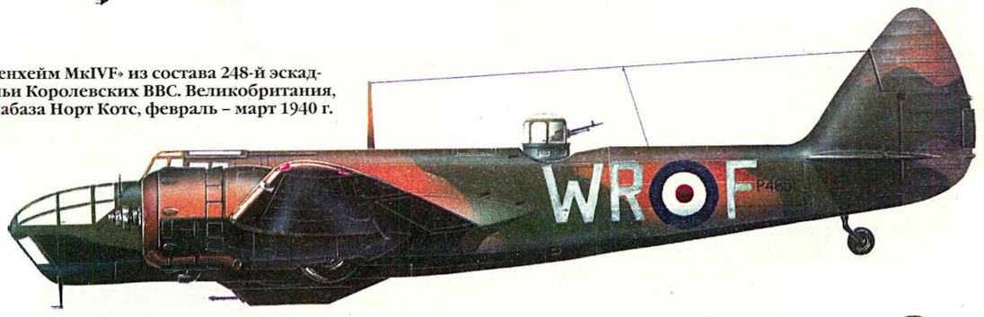 "Бленхейм Mk IF" из состава 219-й истребительной эскадрильи. Обратите внимание на вспучившуюся обшивку нижних поверхностей консолей. Косвенно это свидетельство доказывает тот факт, что данный истребитель был получен путем переделки серийного бомбардировщика. Видимо, большая часть двухмоторных истребителей данного типа была получена путем переделки самолетов, которыми была оснащена в 1937-1938 гг. 5-я авиагруппа, перешедшая на "Хэмпдены".