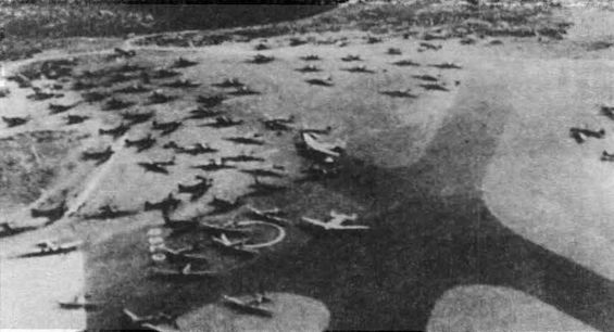 Фотоснимок центральной части аэродрома Форнебу (район Осло), сделанный экипажем "Бленхейма" 30 апреля 1940 г. Среди многочисленных транспортных Ju52, видна пара серебристых четырехмоторных Ju90.