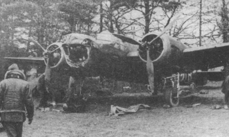 Рейды к фиордам обходились дорого. На снимке: тяжело поврежденный бомбардировщик 21-й эскадрильи. 37-мм зенитный снаряд разорвался в передней кабине, выворотив значительную часть переплета и убив штурмана, тело которого лежит под брезентом на носилках.
