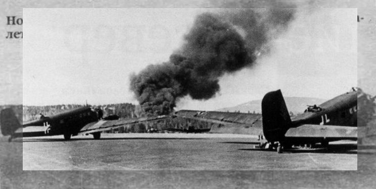 Германские самолеты быстро начали использовать в своих целях захваченные норвежские аэродромы. Данная фотография датирована 15 апреля 1940 года - самолеты Ju52/3m в аэропорту Осло. На заднем плане горит норвежский истребитель Gloster Gladiator.Самолёты на фотографии: Junkers Ju.52/3m - Германия - 1931
