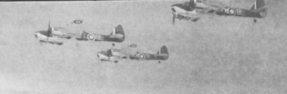 Группа "четверок"-истребителей из состава 235-й эскадрильи Берегового Командования, весна 1940 г. Под консолями хорошо видны трубки для аварийного слива топлива.