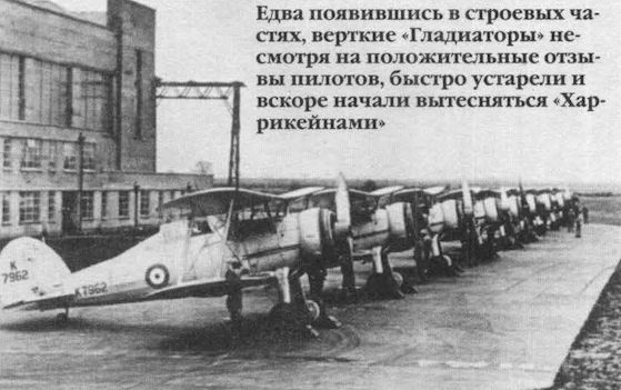 Регистрационный номер: K7962 Едва появившись в строевых частях, верткие "Гладиаторы" несмотря на положительные отзывы пилотов, быстро устарели и вскоре начали вытесняться "Харрикейнами".
