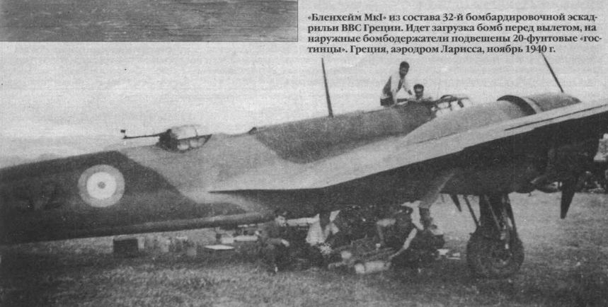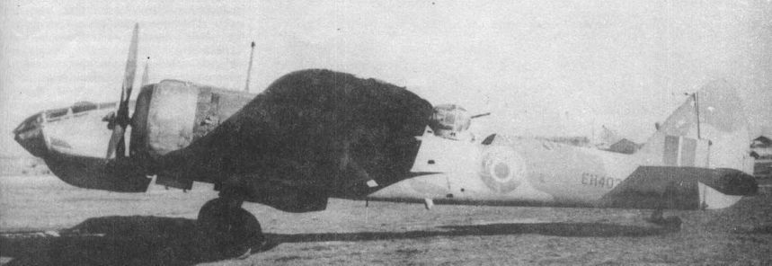 Один из 12 "Бленхеймов Mk IV", переданных грекам весной 1940г. Самолет несет гражданские бортовые коды, нанесенные легкосмываемой краской поверх стандартного камуфляжа Королевских ВВС.