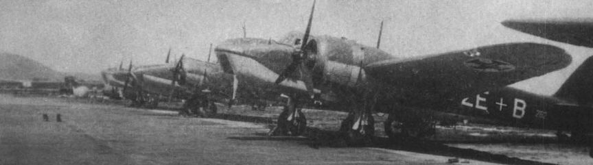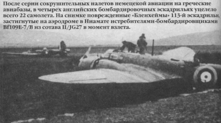После серии сокрушительных налетов немецкой авиации на греческие авиабазы, в четырех английских бомбардировочных эскадрильях уцелело всего 22 самолета. На снимке поврежденные «Бленхеймы» 113-й эскадрильи, застигнутые на аэродроме в Ниамате истребителями-бомбардировщиками Bf109E-7/B из состава II/JG27 в момент взлета.